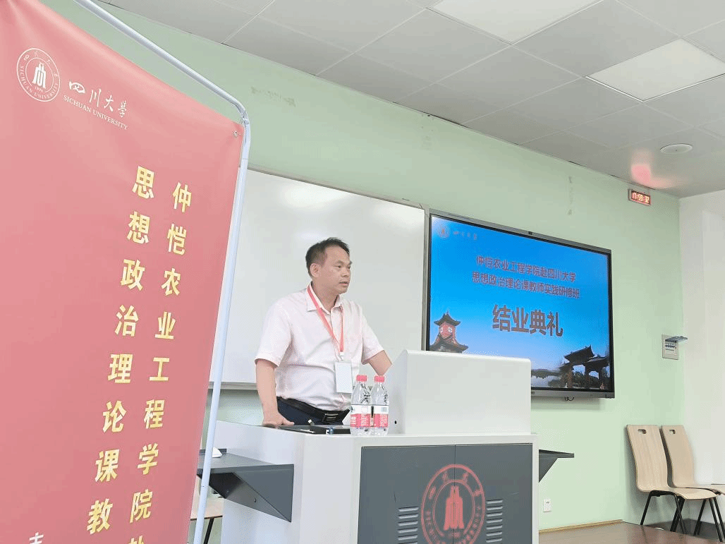 蔡立彬院长对本次实践研修活动进行了总结。首先,他对四川大学马克思主义学院的精心组织和安排表示了感谢,认为本次实践研修活动内容丰富、形式多样,通过学术讲座、现场教学相结合的方式,让学员们对四川的历史底蕴、文明传承、家国情怀、乡村振兴等方面有了全方位的了解,为我们提供了鲜活的教学素材,拓宽了我们的视野与思维;其次,他称赞了本次研修过程中全体学员的精神风貌,认为学员们展现了认真积极的学习态度,不放过任何一个学习机会,即使天气炎热、行程紧凑也毫无怨言,展现了吃苦耐劳的精神;第三,他认为此次研修对仲恺马院有多方面的积极意义,高水平的学术讲座和丰富多彩的现场教学,能够有效促进我院老师教学水平的提升、科研思路的拓展、管理工作的改进。