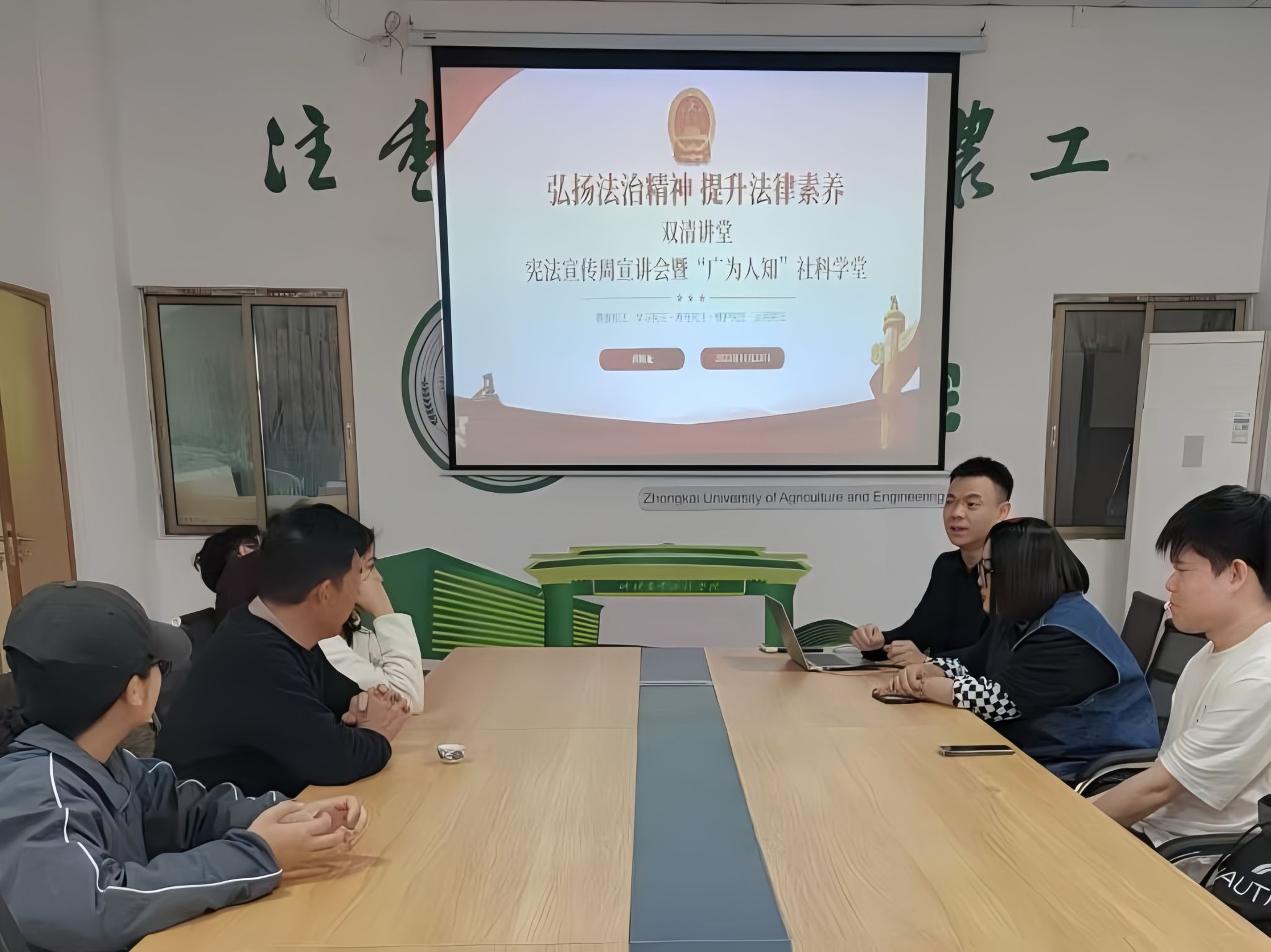 本次活动以弘扬法治精神,提升法律素养为主题,系仲恺农业工程学院双清讲堂第三讲暨广为人知社科学堂系列活动。活动由仲恺农业工程学院马克思主义学院讲师、博士后黄斯龙主讲,科技小院入驻专家、广州市白云区汇丰泰专业合作社联合社(以下简称联合社)理事长曾令华受邀出席并讲话。我校部分师生代表及联合社成员参加了此次学习。