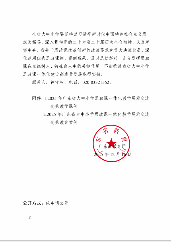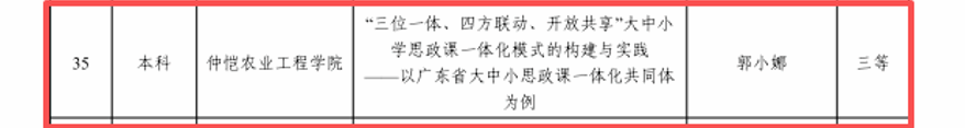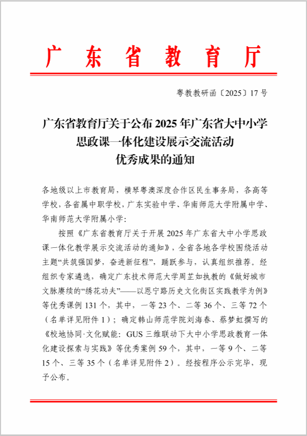 12月16日,2025年广东省大中小学思政课一体化教学展示交流活动结果揭晓,我校马克思主义学院专任教师郭小娜撰写的《“三位一体、四方联动、开放共享”大中小学思政课一体化模式的构建与实践——以广东省大中小学思政课一体化共同体为例》荣获优秀教育案例三等奖。