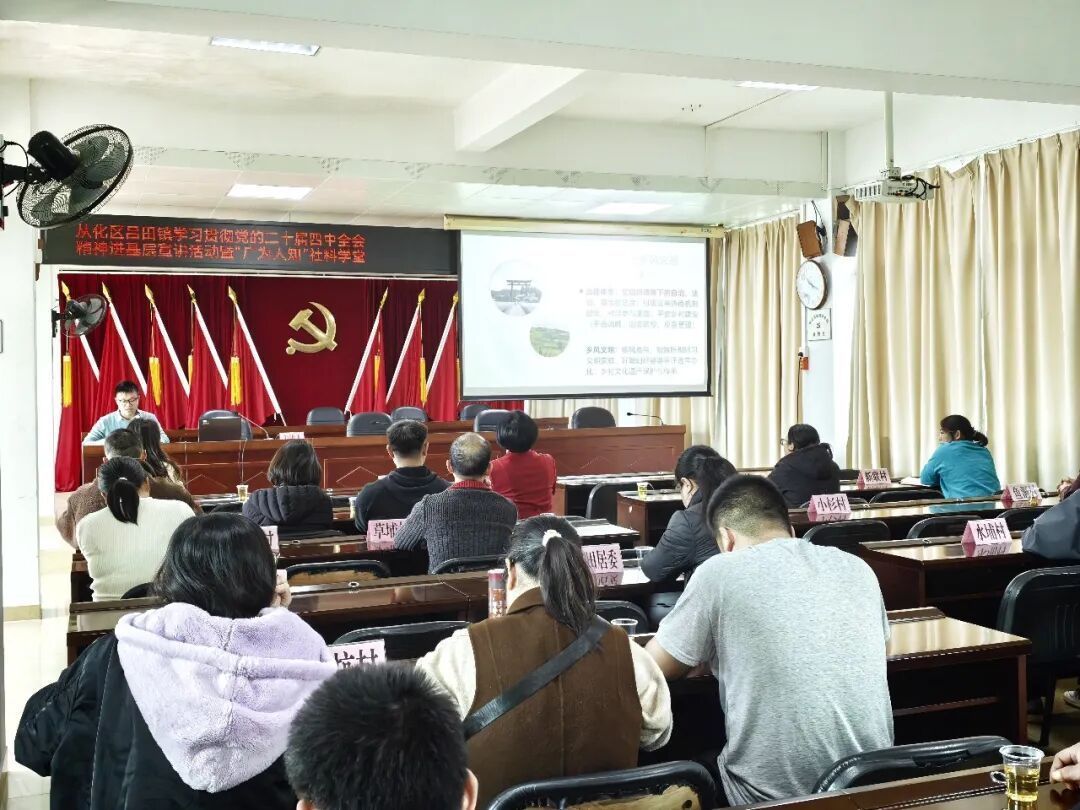 为扎实推动党的二十届四中全会精神在基层落地见效,精准对接“十五五”时期发展部署,进一步凝聚全镇上下投身“百千万工程”的强大合力,2月5日下午,从化区学习贯彻党的二十届四中全会精神进基层宣讲活动暨“广为人知”社科学堂在吕田镇人民政府成功举办。此次活动由广州市社会科学界联合会、仲恺农业工程学院、从化区新时代文明实践中心、从化区委宣传部联合主办,依托吕田镇新时代文明实践阵地优势,深度结合革命老区振兴发展实际,为吕田高质量发展筑牢思想根基、注入精神动力。