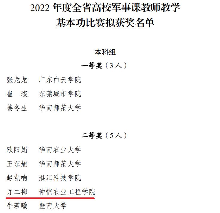 2022年12月29日,广东省教育厅在官网上公示了2022年度全省高校军事课教师教学基本功比赛拟获奖名单。根据广东省教育厅、广东省军区战备建设局《关于举办2022年度全省高校军事课教师教学基本功比赛的通知》要求,马克思主义学院积极组织专兼职“军事理论”课教师备战比赛,经过校内初赛、专家点评、学校审核等环节,许二梅副教授以全校第一名的成绩被推荐参加省赛的复赛和决赛。